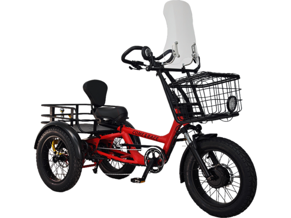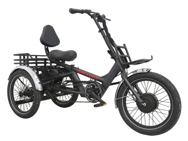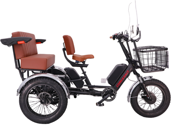 电池:一组48V20AH,IPX8全防水动力锂电池;助力续航100KM;电子变速5速;三轮液压碟刹制动,三轮力矩驱动。